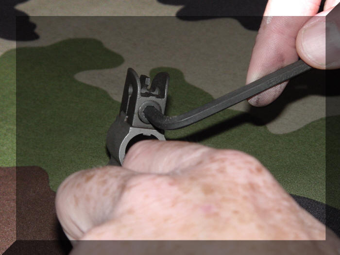 De volgende stap is het plaatsen van de korrel montagebout ( Front Sight Screw ) in de korrel ( Front Sight ) zorg er nu voor dat de korrel in exact in het midden van de gas cilinder staat en draai deze dan met en 3/16 inch inbussleutel rechtsom vast, als de korrel montagebout tijdens het schieten loskomt kan men deze eventueel vast zetten met Nutlock ( Loctite )