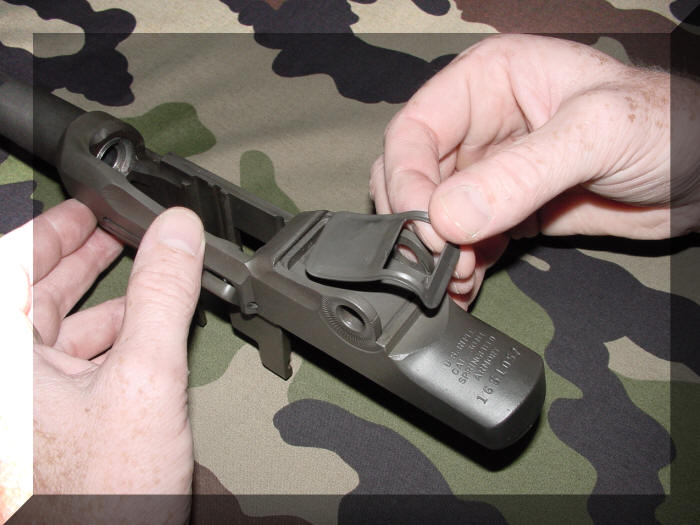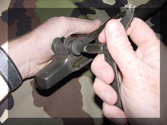 De volgende stap kan voor sommige mensen een klein beetje lastig zijn we gaan het beschermdeksel ( Spring Cover ) van de viziergroep vast zetten in het afsluiterhuis ( Receiver ), controleer of de voorkant van het beschermdeksel ( Spring Cover ) in de voorste groef aan de voorkant van het afsluiterhuis ( Receiver ) zit, zet het vizier montageblok ( Rear Sight Base ) ongeveer in het midden op het afsluiterhuis ( Receiver ) en til met de linkerhand het vizier montageblok ( Rear Sight Base ) iets omhoog zodat men met het schroevendraaier gedeelte van de GI Combo Tool het beschermdeksel ( Spring Cover ) in de achterste groef kan drukken op het afsluiterhuis ( Receiver ).