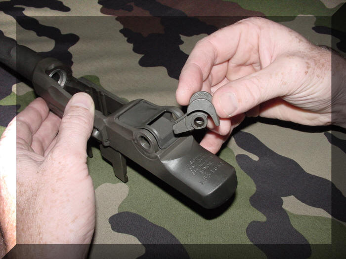 Daarna plaatsen we het vizier montageblok ( Rear Sight Base ) men neemt het vizier montageblok ( Rear Sight Base ) tussen duim en wijsvinger en schuift het door het rechthoekige gat van het beschermdeksel ( Spring Cover ) op zijn plaats.
