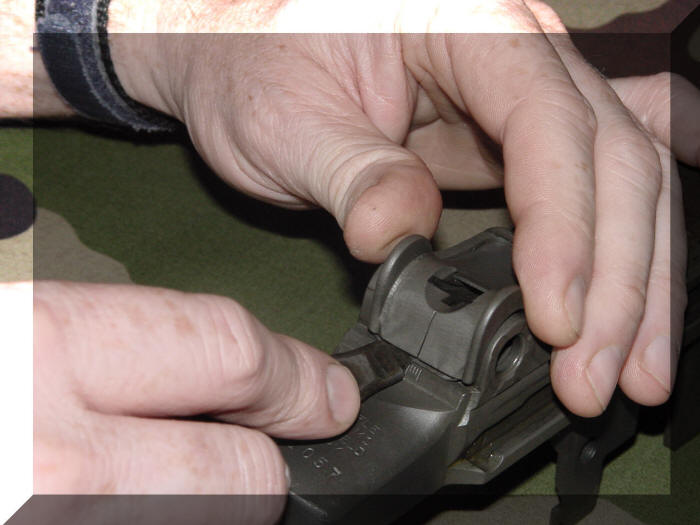 Nu nemen we de diopter ( Rear Sight Aperture ) tussen duim en wijsvinger en schuiven hem in de uitsparing in het vizier montageblok ( Rear Sight Base ) totdat de diopter ( Rear Sight Aperture ) niet verder in het vizier montageblok ( Rear Sight Base ) naar beneden kan.