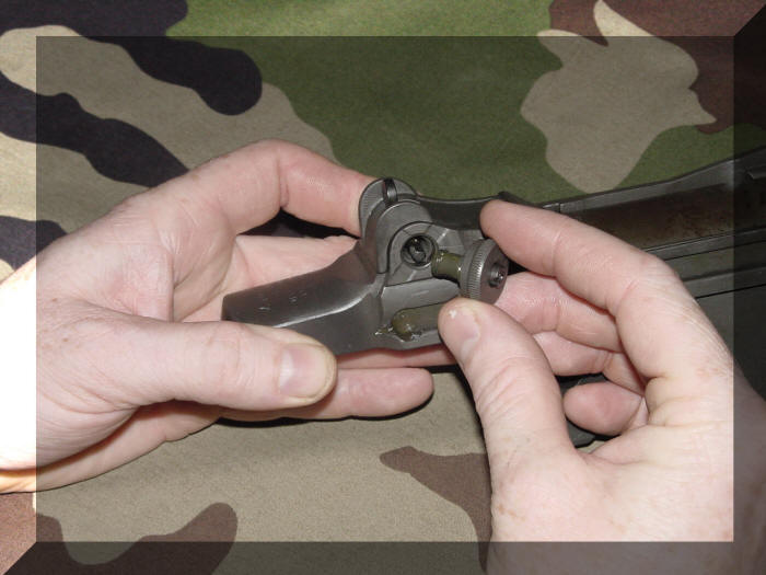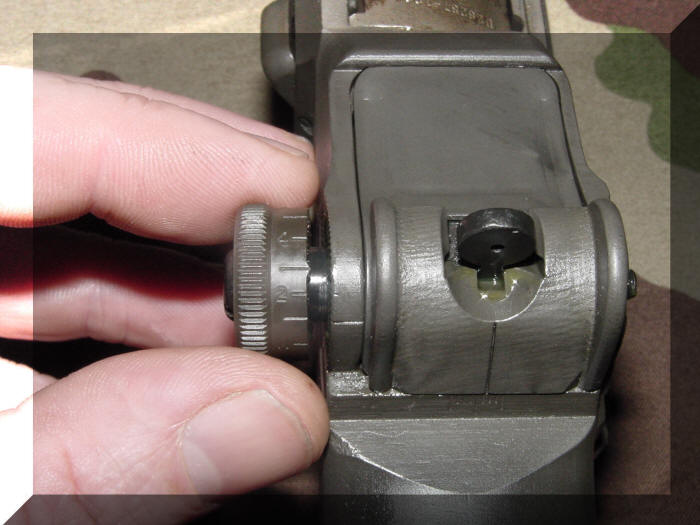De laatste stap is het vastzetten van de bevestigingsschroef van de wind correctieknop ( Windage Knob ) aan de elevatieknop ( Elevation Knob ). Draai met het schroevendraaier gedeelte van de GI Combo Tool de bevestigingsschroef van de wind correctieknop ( Windage Knob ) rechtsom vast, controleer bij het vast zetten of de elevatieknop ( Elevation Knob ) en de wind correctieknop ( Windage Knob ) nog kunnen draaien. Met het losser of vaster zetten van de bevestigingsschroef van de wind correctieknop ( Windage Knob ) stelt men de weerstand van beide knoppen in. Een klein trucje van het controleren van afstelling is als de diopter ( Rear Sight ) iets uitgedraaid staat hem met de duim niet naar binnen kan drukken.